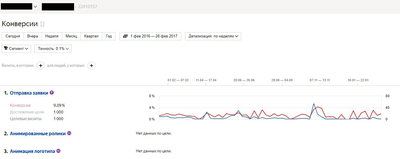 Данные по конверсии форм на сайте за анализируемые кварталы 2016-2018 года